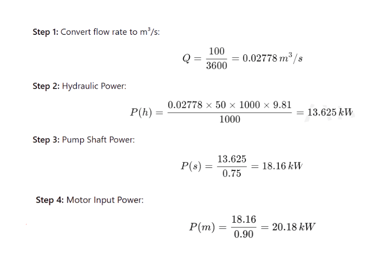 To make this easier, we’ve created a Pump Shaft Power & Motor Power Calculator (embedded above). Simply enter the flow rate, head, pump efficiency, and motor efficiency, and the tool will instantly give you: